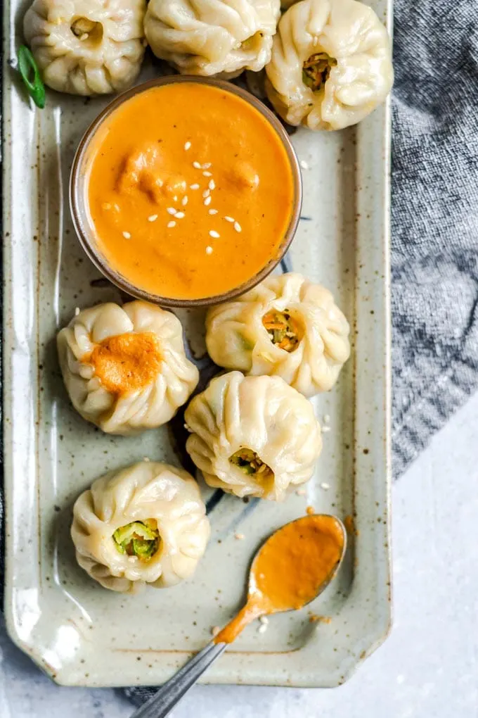 - Serve with the dipping sauce in a small bowl or drizzle lightly over the momos.