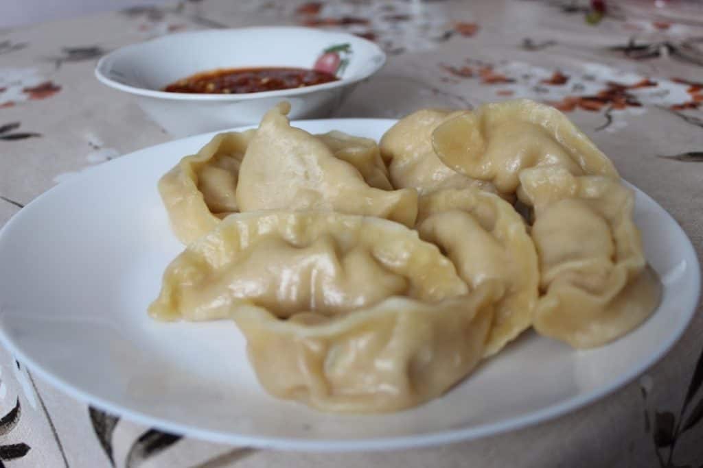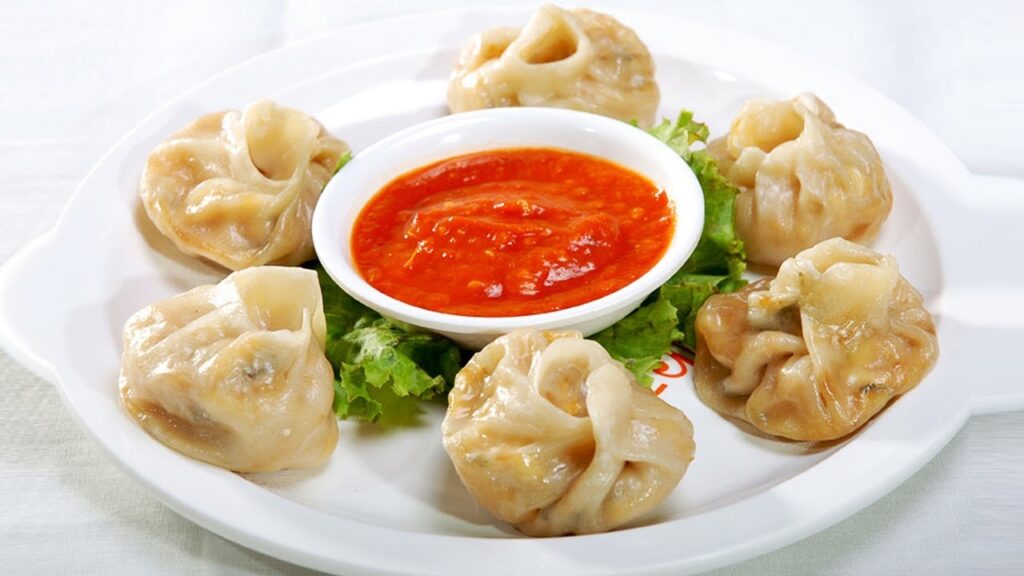 Freshly steamed momos paired with sweet garlic chutney provide a harmonious combination of textures, flavors, and colors.