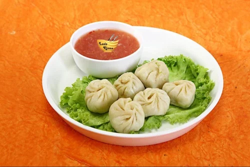 Vegetarian momos are a healthy source of carbohydrates, fiber, vitamins, and minerals. Steaming minimizes added fats while preserving nutrients. Carrots and cabbage provide dietary fiber, vitamin A, and vitamin C, promoting satiety and overall health. The sweet garlic chutney adds flavor with minimal additional calories, making this combination suitable for a wholesome meal.