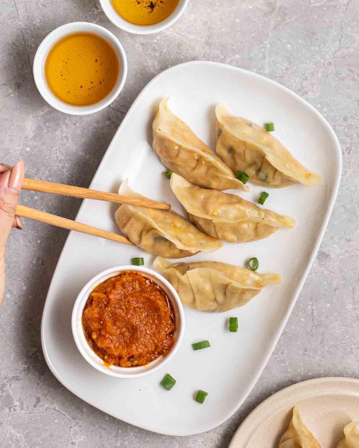 - Serve hot with the sweet garlic chutney on the side or lightly drizzled over the momos.