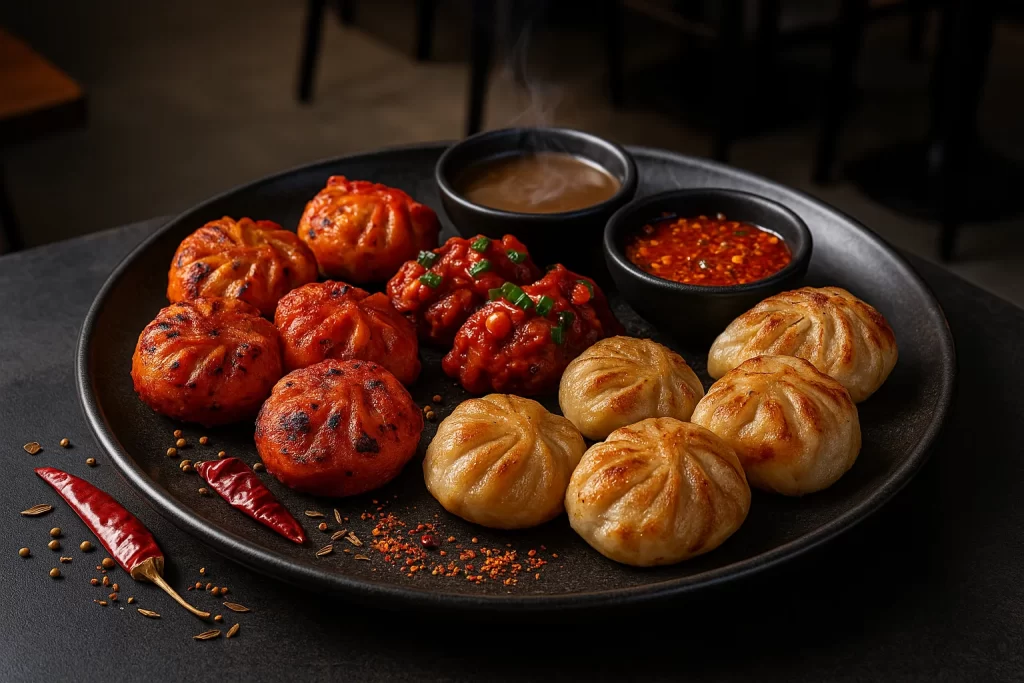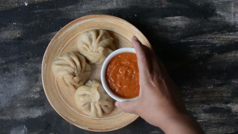 The chili oil dip should balance heat, tanginess, and umami, providing a bold contrast to the soft, savory momos.